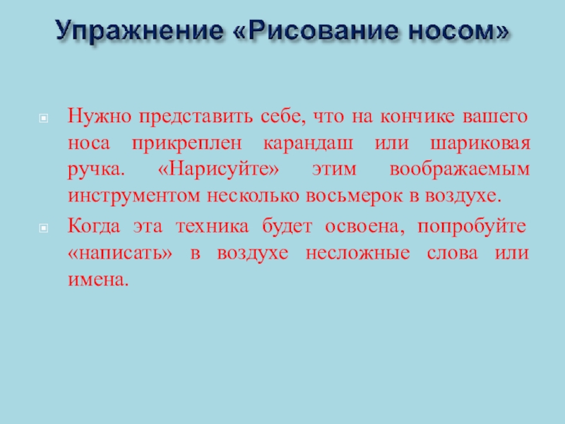 Слайд 49Нужно представить себе, что на кончике вашего носа прикреплен карандаш или