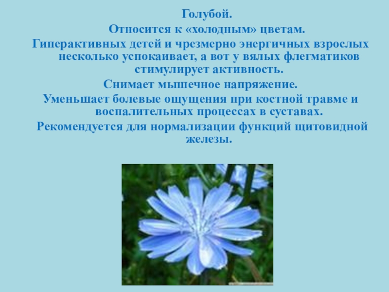 Тоже «холодный» цвет. У спокойных детей вызывает некоторое замедление обменных