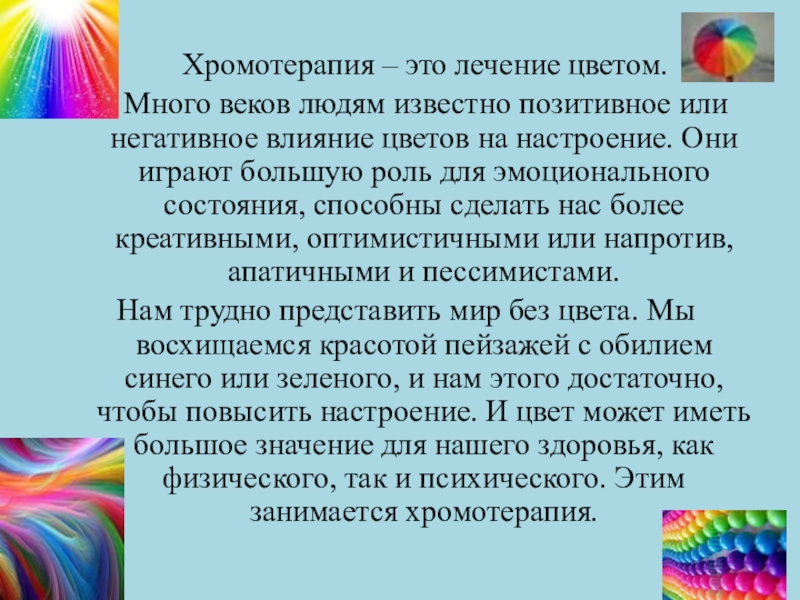 Нам трудно представить мир без цвета. Мы восхищаемся красотой пейзажей с обилием синего или зеленого, и нам этого достаточно, чтобы повысить настроение. И цвет может иметь большое значение для нашего здоровья, как физического, так и психического. Этим занимается хромотерапия.