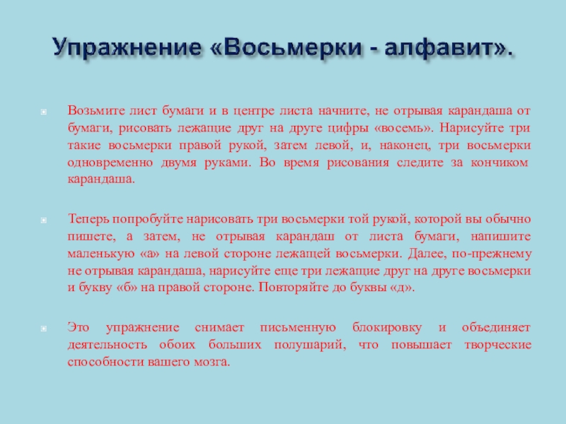 Это упражнение снимает письменную блокировку и объединяет деятельность обоих больших полушарий, что повышает творческие способности вашего мозга.
