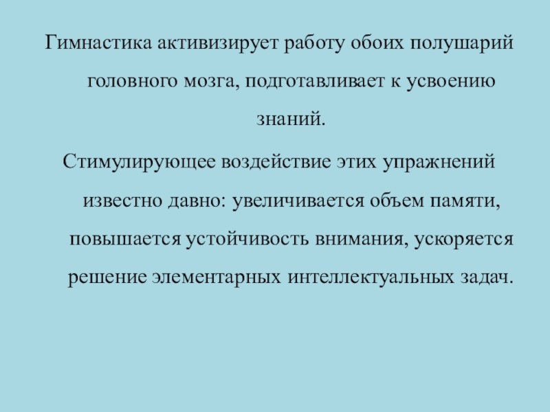 Слайд 41Гимнастика активизирует работу обоих полушарий головного мозга, подготавливает к усвоению знаний.
