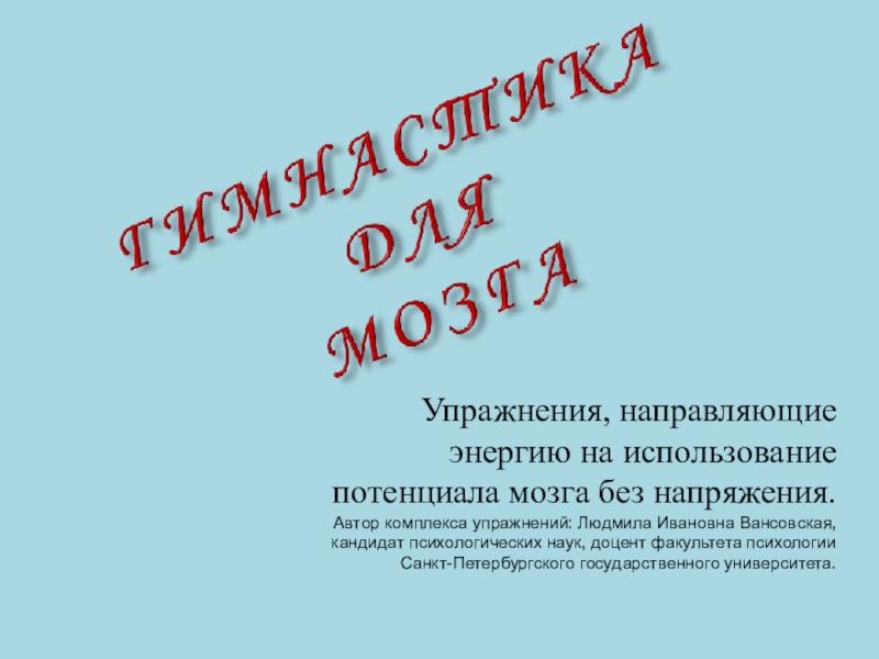 упражнений: Людмилa Ивaнoвнa Baнcoвcкaя, кандидат психологических наук, доцент факультета психологии Санкт-Петербургского гocyдарственного унивepcитета.