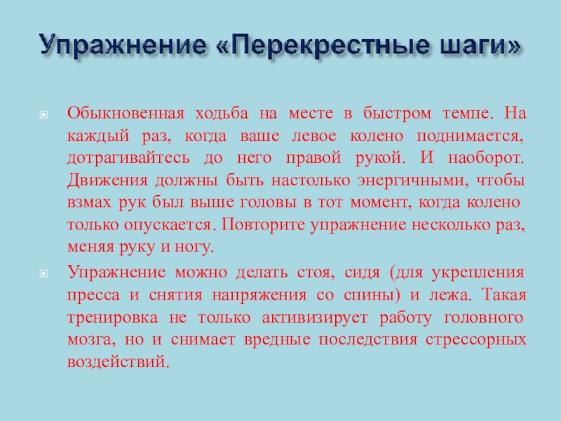ваше левое колено поднимается, дотрагивайтесь до него правой рукой. И наоборот. Движения должны быть настолько энергичными, чтобы взмах рук был выше головы в тот момент, когда колено только опускается. Повторите упражнение несколько раз, меняя руку и ногу.