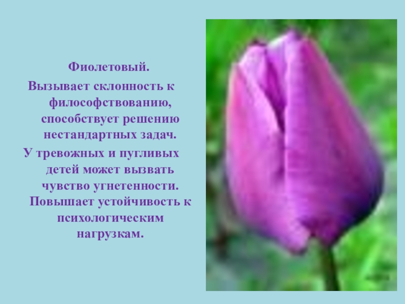 процессов, характерное для перехода ко сну. У впечатлительных ребятишек с подвижным типом нервной системы может, как и голубой, вызвать ощущение страха. Нормализуя работу гипофиза, влияет на состояние всей эндокринной системы, а также может использоваться для лечения энуреза.