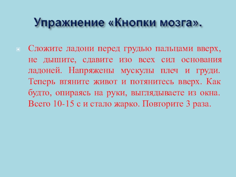 Слайд 47Сложите ладони перед грудью пальцами вверх, не дышите, сдавите изо всех