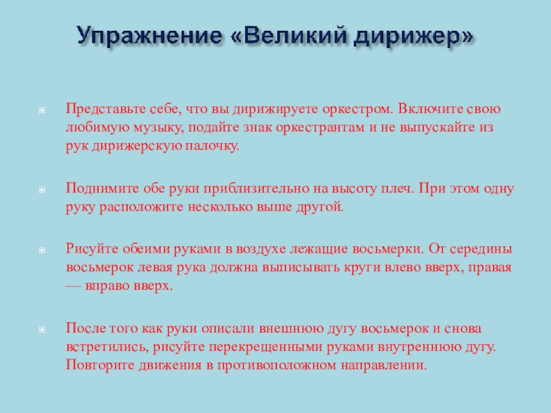 Слайд 45Представьте себе, что вы дирижируете оркестром. Включите свою любимую музыку, подайте