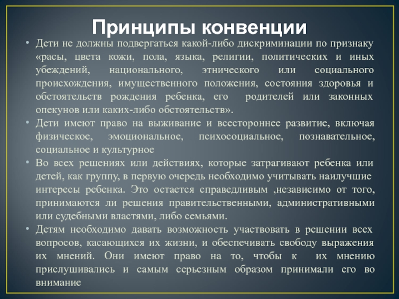 кожи, пола, языка, религии, политических и иных убеждений, национального, этнического или социального происхождения, имущественного положения, состояния здоровья и обстоятельств рождения ребенка, его родителей или законных опекунов или каких-либо обстоятельств».