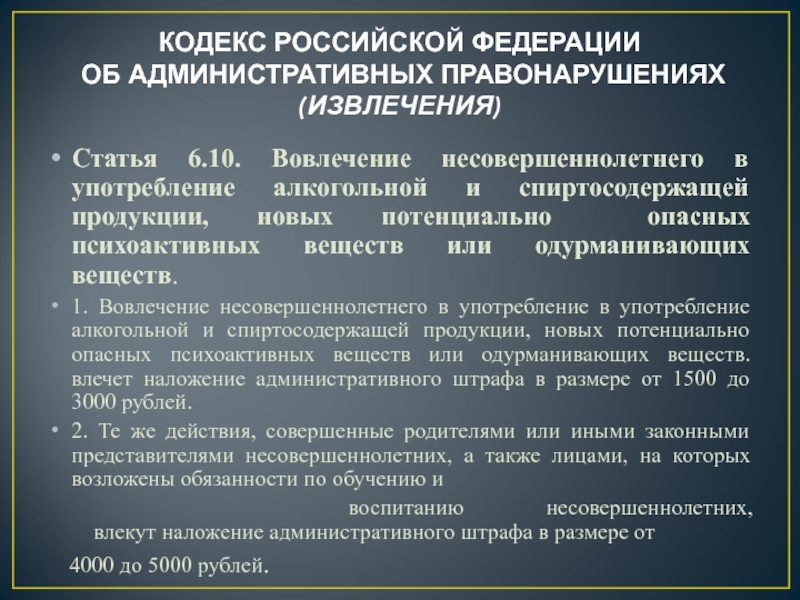 влечет наложение административного штрафа на родителей или иных законных представителей несовершеннолетних в размере от 1500 до 200 0рублей.