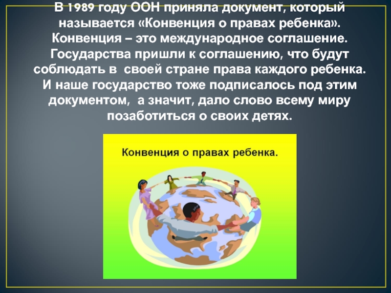 Слайд 3В 1989 году ООН приняла документ, который называется «Конвенция о правах