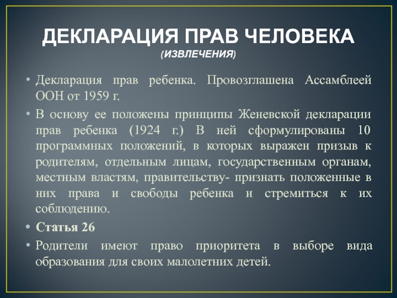 В основу ее положены принципы Женевской декларации прав ребенка (1924 г.) В ней сформулированы 10 программных положений, в которых выражен призыв к родителям, отдельным лицам, государственным органам, местным властям, правительству- признать положенные в них права и свободы ребенка Всеобщая декларация прав человека