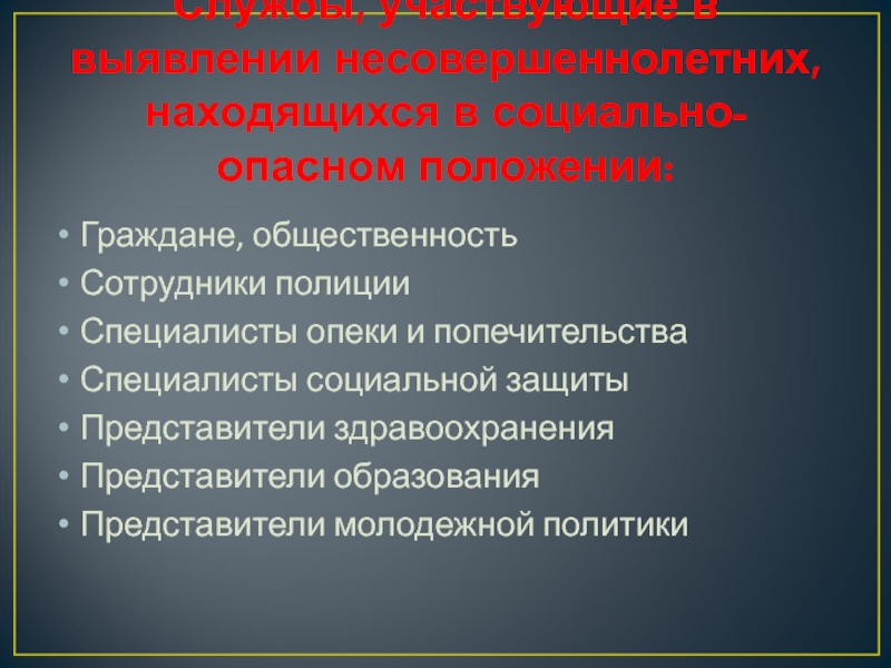 Слайд 25Службы, участвующие в выявлении несовершеннолетних, находящихся в социально-опасном положении: