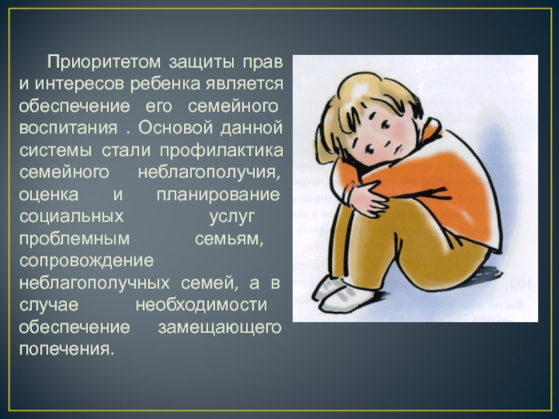 Слайд 28 Приоритетом защиты прав и интересов ребенка является обеспечение его семейного