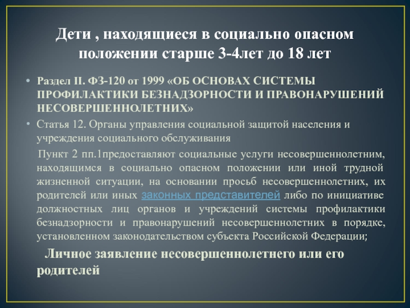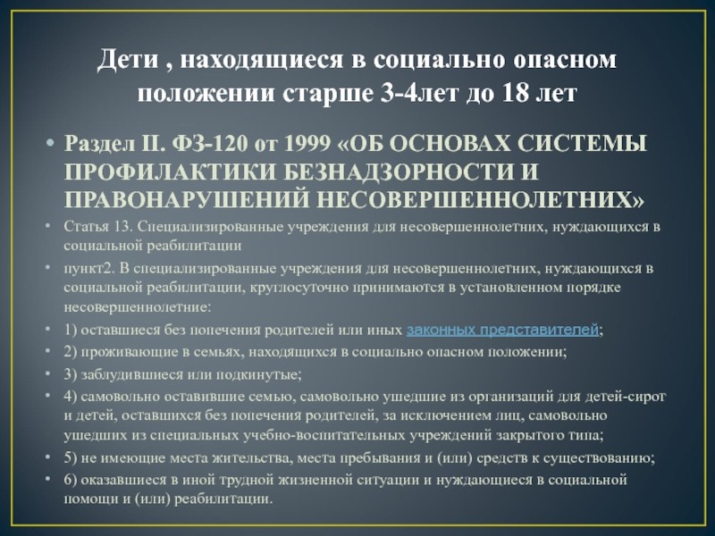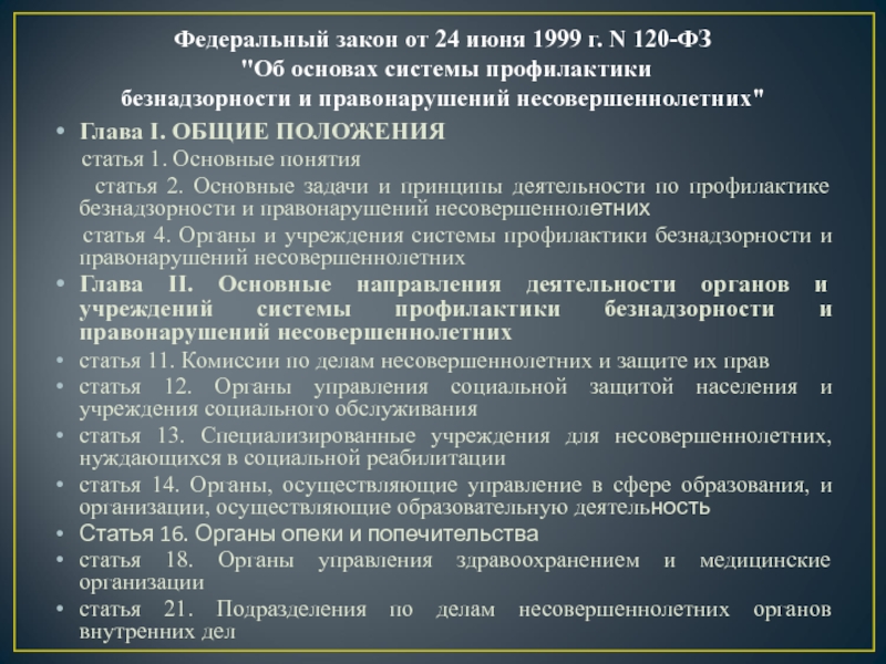 II. ФЗ-120 от 1999 «ОБ ОСНОВАХ СИСТЕМЫ ПРОФИЛАКТИКИ БЕЗНАДЗОРНОСТИ И ПРАВОНАРУШЕНИЙ НЕСОВЕРШЕННОЛЕТНИХ»