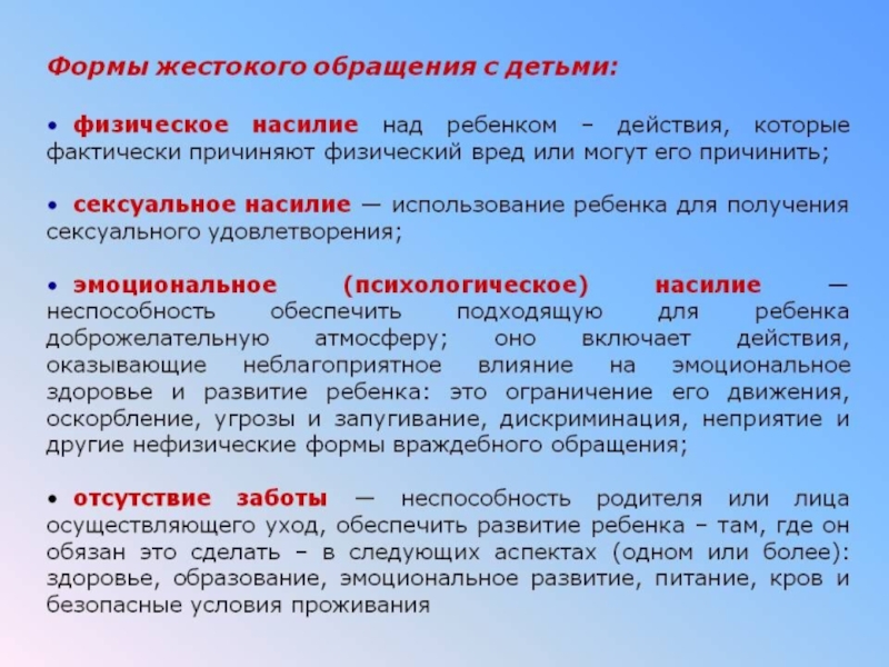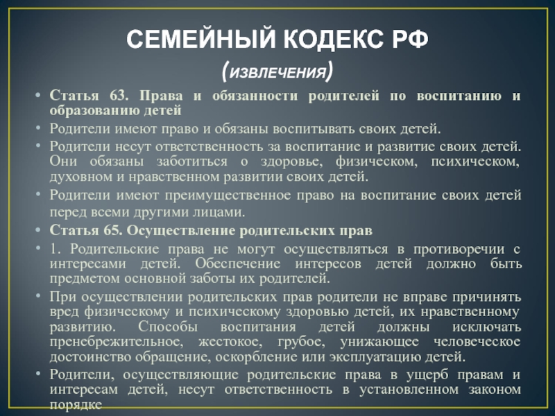 При осуществлении родительских прав родители не вправе причинять вред физическому и психическому здоровью детей, их нравственному развитию. Способы воспитания детей должны исключать пренебрежительное, жестокое, грубое, унижающее человеческое достоинство обращение, оскорбление или эксплуатацию детей.