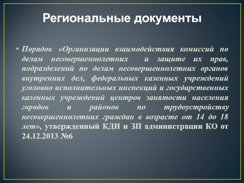 прав, подразделений по делам несовершеннолетних органов внутренних дел, федеральных казенных учреждений уголовно исполнительных инспекций и государственных казенных учреждений центров занятости населения городов и районов по трудоустройству несовершеннолетних граждан в возрасте от 14 до 18 лет», утвержденный КДН и ЗП администрации КО от 24.12.2013 №6