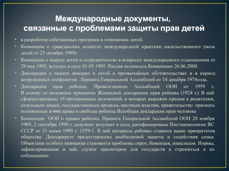 Конвенция ООН о правах ребенка. Принята Генеральной Ассамблеей ООН 20 ноября 1989, 2 сентября 1990 г. документ вступает в силу, ратифицирована Постановлением ВС СССР от 31 июня 1990 г. 1559-1. В ней интересы ребенка ставятся выше приоритетов общества. Декларирует предоставление необходимой защиты и содействия семье. Объектами особого внимания становятся проблемы сирот, беженцев, инвалидов. Нормы, зафиксированные в ней, служат ориентиром для государств и стремиться к их соблюдению.