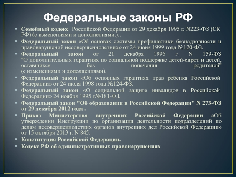 Федеральный закон «Об основах системы профилактики безнадзорности и правонарушений несовершеннолетних» от 24 июня 1999 года №120-ФЗ.
