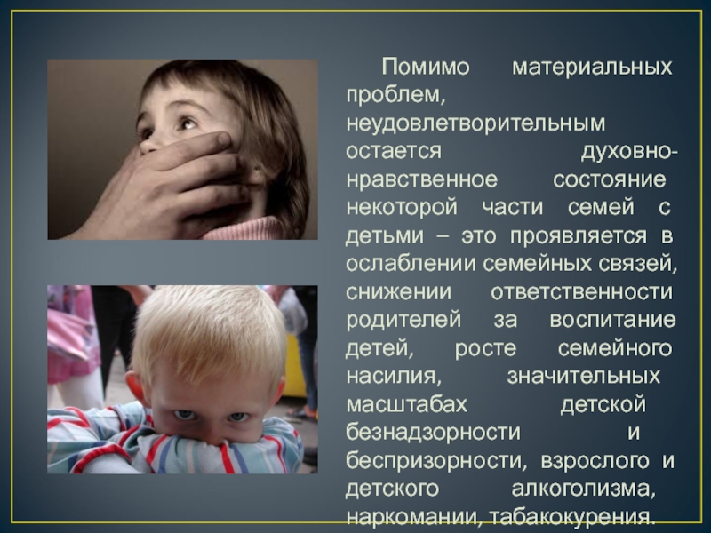 Слайд 27 Помимо материальных проблем, неудовлетворительным остается духовно-нравственное состояние некоторой части семей с