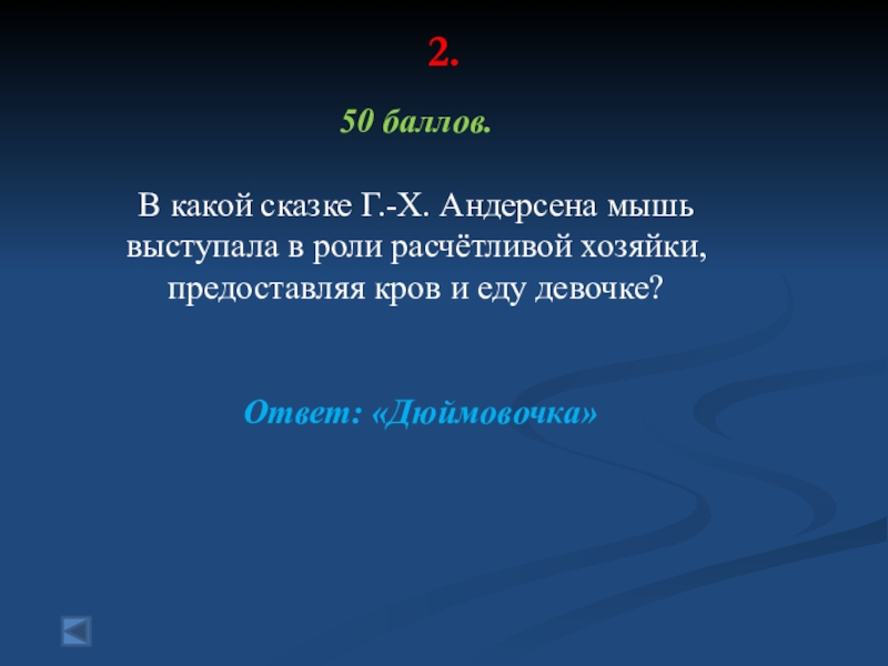 2.  50 баллов.В какой сказке Г.-Х. Андерсена мышь выступала в роли расчётливой хозяйки, предоставляя кров и