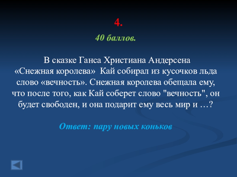 4. 40 баллов.  В сказке Ганса Христиана Андерсена «Снежная королева» Кай собирал из кусочков льда слово «вечность».