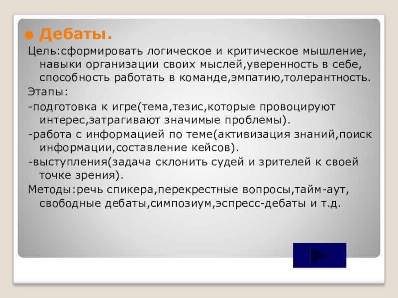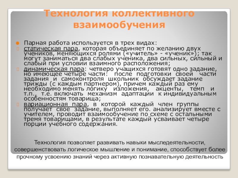 Технология позволяет развивать навыки мыследеятельности, совершенствовать логическое мышление и понимание, способствует более прочному усвоению знаний через активную познавательную деятельность