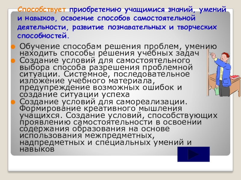 Создание условий для самостоятельного выбора способа разрешения проблемной ситуации. Системное, последовательное изложение учебного материала, предупреждение возможных ошибок и создание ситуации успеха