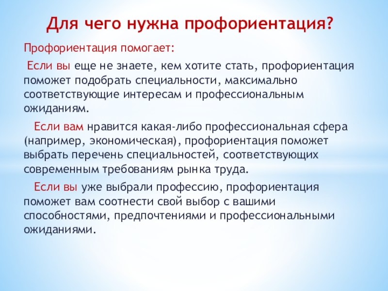 Если вам нравится какая-либо профессиональная сфера (например, экономическая), профориентация поможет выбрать перечень специальностей, соответствующих современным требованиям рынка труда.