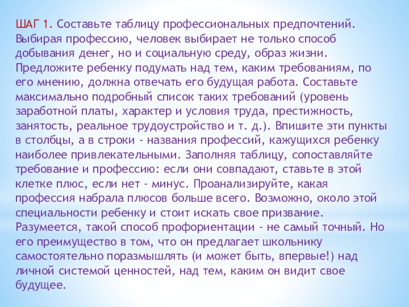 Слайд 5ШАГ 1. Составьте таблицу профессиональных предпочтений. Выбирая профессию, человек выбирает не