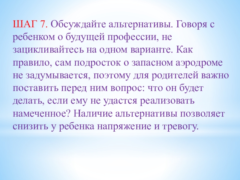 Слайд 11ШАГ 7. Обсуждайте альтернативы. Говоря с ребенком о будущей профессии, не