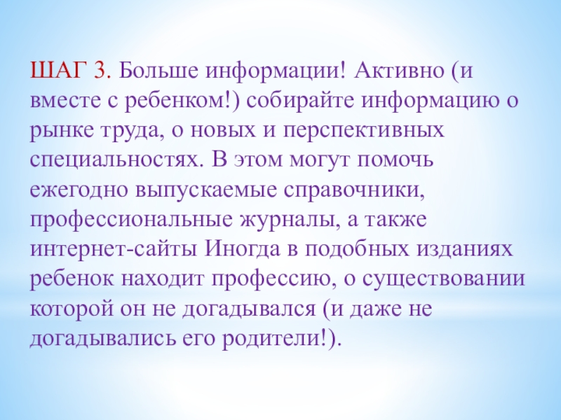 Слайд 7ШАГ 3. Больше информации! Активно (и вместе с ребенком!) собирайте информацию