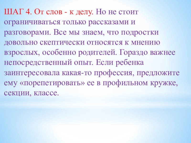 Слайд 8ШАГ 4. От слов - к делу. Но не стоит ограничиваться