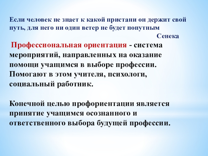 Конечной целью профориентации является принятие учащимся осознанного и ответственного выбора будущей профессии.