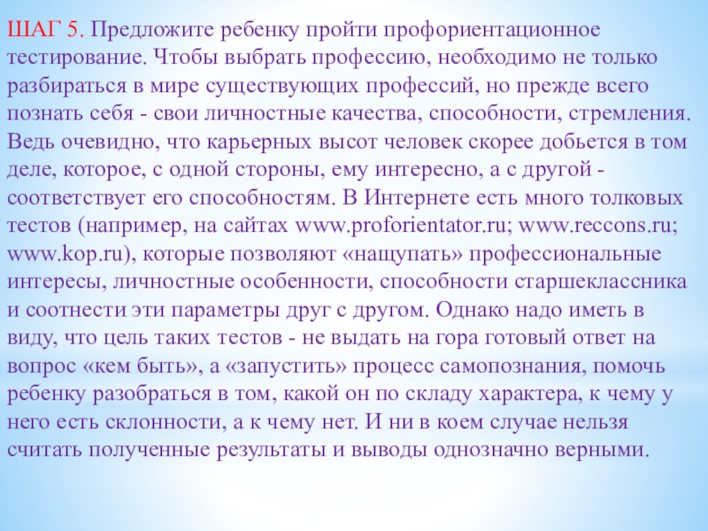 Слайд 9ШАГ 5. Предложите ребенку пройти профориентационное тестирование. Чтобы выбрать профессию, необходимо