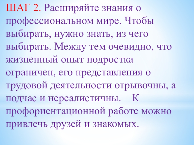 Слайд 6ШАГ 2. Расширяйте знания о профессиональном мире. Чтобы выбирать, нужно знать,