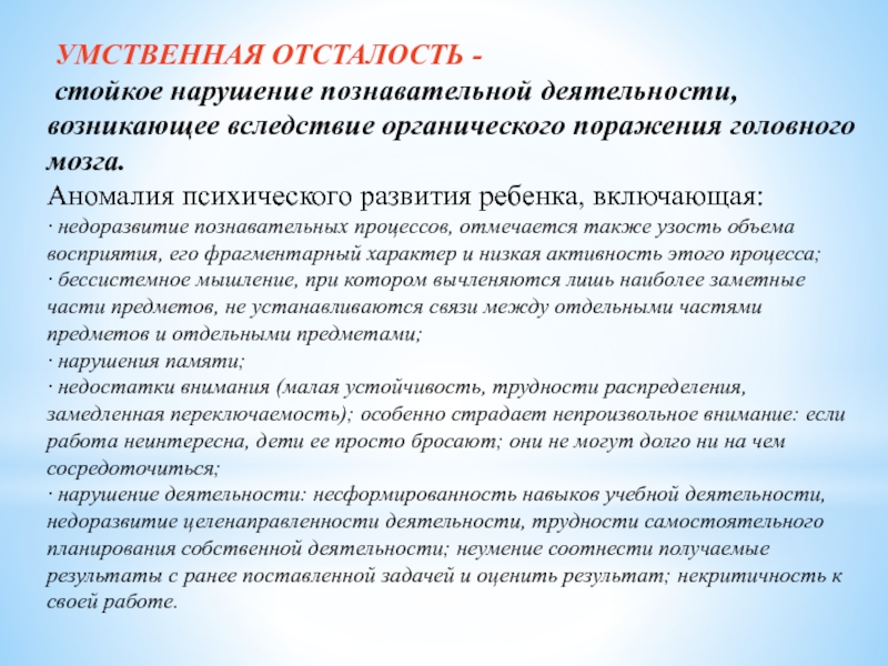 Слайд 4 УМСТВЕННАЯ ОТСТАЛОСТЬ -