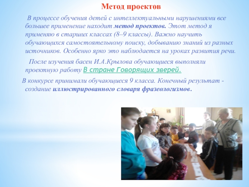 все большее применение находит метод проектов. Этот метод я применяю в старших классах (8–9 классы). Важно научить обучающихся самостоятельному поиску, добыванию знаний из разных источников. Особенно ярко это наблюдается на уроках развития речи.