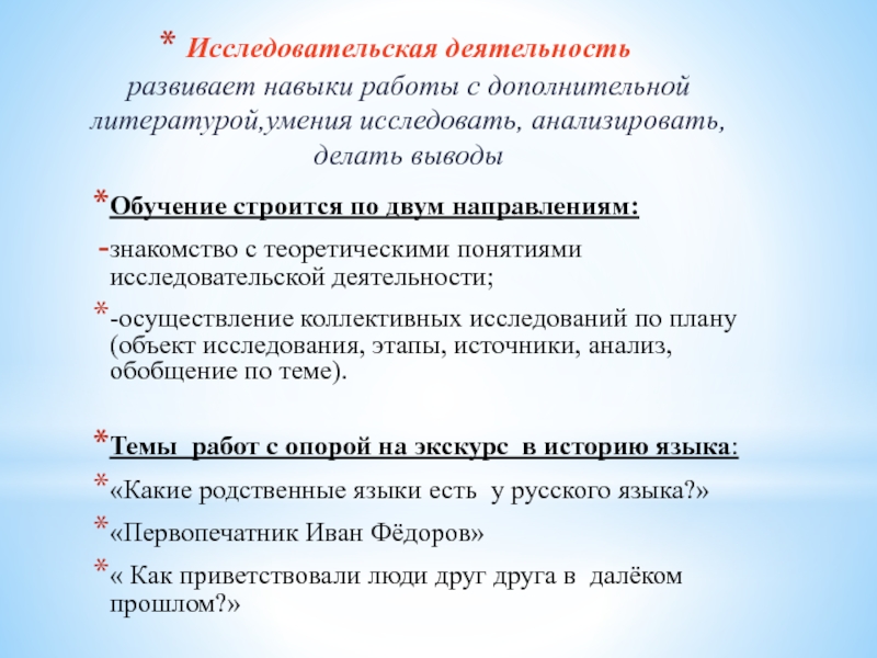 знакомство с теоретическими понятиями исследовательской деятельности;