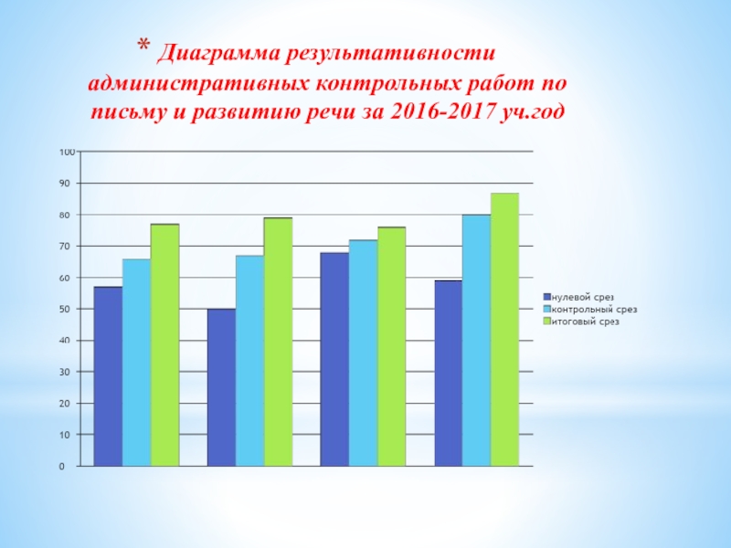 Слайд 19Диаграмма результативности административных контрольных работ по письму и развитию речи за