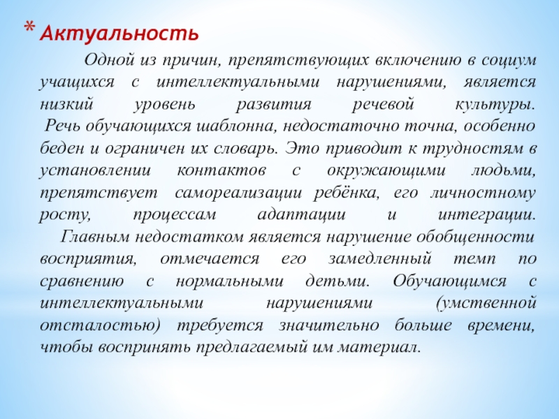 Речь обучающихся шаблонна, недостаточно точна, особенно беден и ограничен их словарь. Это приводит к трудностям в установлении контактов с окружающими людьми, препятствует самореализации ребёнка, его личностному росту, процессам адаптации и интеграции.