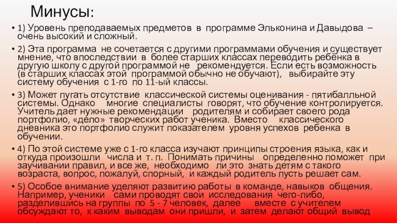 2) Эта программа не сочетается с другими программами обучения и существует мнение, что впоследствии в более старших классах переводить ребёнка в другую школу с другой программой не рекомендуется. Если есть возможность (в старших классах этой программой обычно не обучают), выбирайте эту систему обучения с 1-го по 11-ый классы.