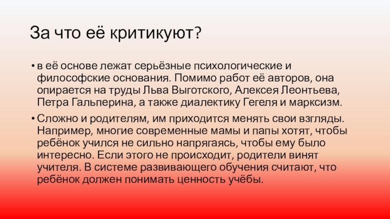 Сложно и родителям, им приходится менять свои взгляды. Например, многие современные мамы и папы хотят, чтобы ребёнок учился не сильно напрягаясь, чтобы ему было интересно. Если этого не происходит, родители винят учителя. В системе развивающего обучения считают, что ребёнок должен понимать ценность учёбы.