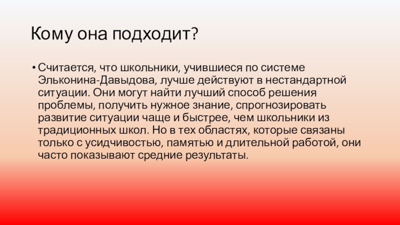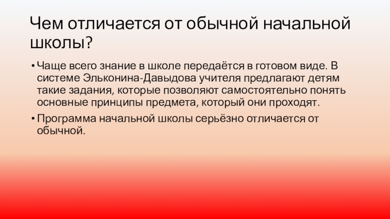 в готовом виде. В системе Эльконина-Давыдова учителя предлагают детям такие задания, которые позволяют самостоятельно понять основные принципы предмета, который они проходят.