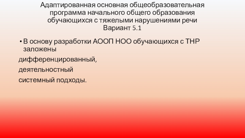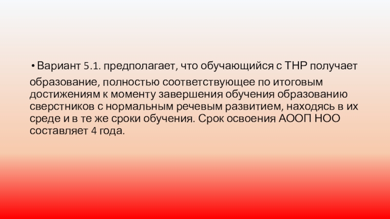 Слайд 15Вариант 5.1. предполагает, что обучающийся с ТНР получает