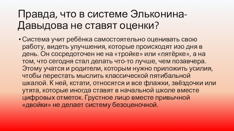 Слайд 7Правда, что в системе Эльконина-Давыдова не ставят оценки?