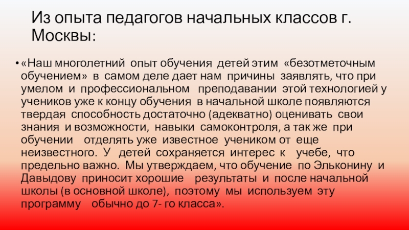 этим «безотметочным обучением» в самом деле дает нам причины заявлять, что при умелом и профессиональном преподавании этой технологией у учеников уже к концу обучения в начальной школе появляются твердая способность достаточно (адекватно) оценивать свои знания и возможности, навыки самоконтроля, а так же при обучении отделять уже известное учеником от еще неизвестного. У детей сохраняется интерес к учебе, что предельно важно. Мы утверждаем, что обучение по Эльконину и Давыдову приносит хорошие результаты и после начальной школы (в основной школе), поэтому мы используем эту программу обычно до 7- го класса».