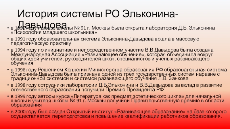 в 1996 году Решением Коллегии Министерства образования РФ образовательная система Эльконина-Давыдова была признана одной из трех государственных систем наравне с традиционной системой и системой развивающего обучения Л.В. Занкова