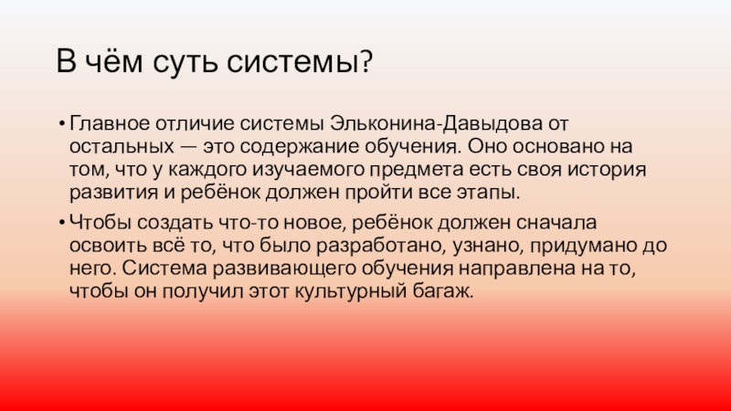 Чтобы создать что-то новое, ребёнок должен сначала освоить всё то, что было разработано, узнано, придумано до него. Система развивающего обучения направлена на то, чтобы он получил этот культурный багаж.