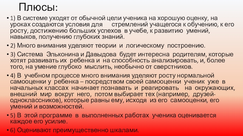 1) Уровень преподаваемых предметов в программе Эльконина и Давыдова – очень