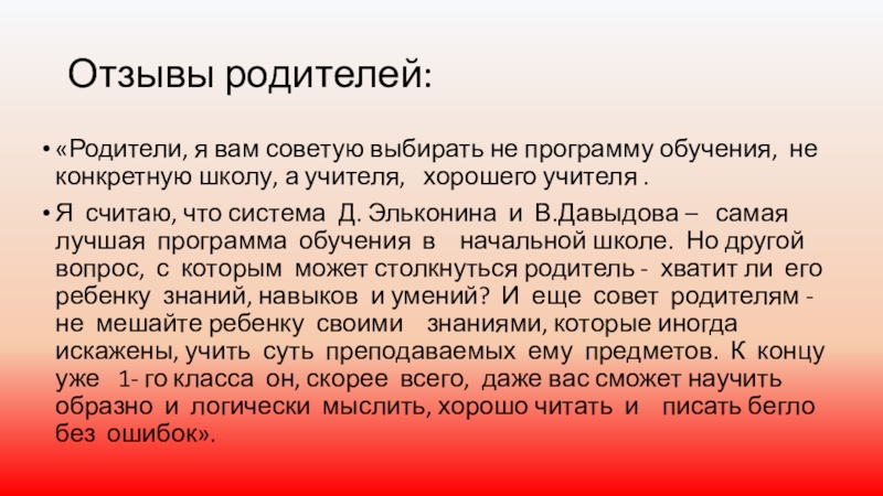 Я считаю, что система Д. Эльконина и В.Давыдова – самая лучшая программа обучения в начальной школе. Но другой вопрос, с которым может столкнуться родитель - хватит ли его ребенку знаний, навыков и умений? И еще совет родителям - не мешайте ребенку своими знаниями, которые иногда искажены, учить суть преподаваемых ему предметов. К концу уже 1- го класса он, скорее всего, даже вас сможет научить образно и логически мыслить, хорошо читать и писать бегло без ошибок».