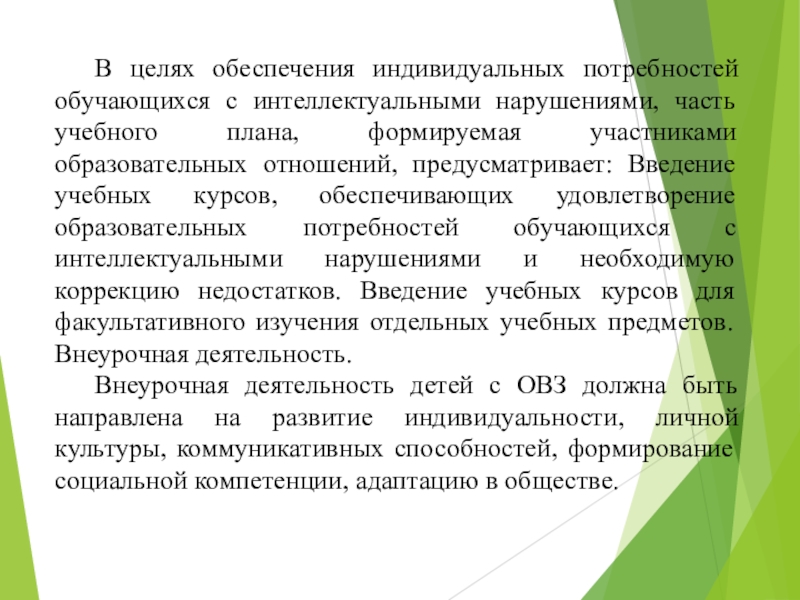 Слайд 16 В целях обеспечения индивидуальных потребностей обучающихся с интеллектуальными нарушениями, часть учебного